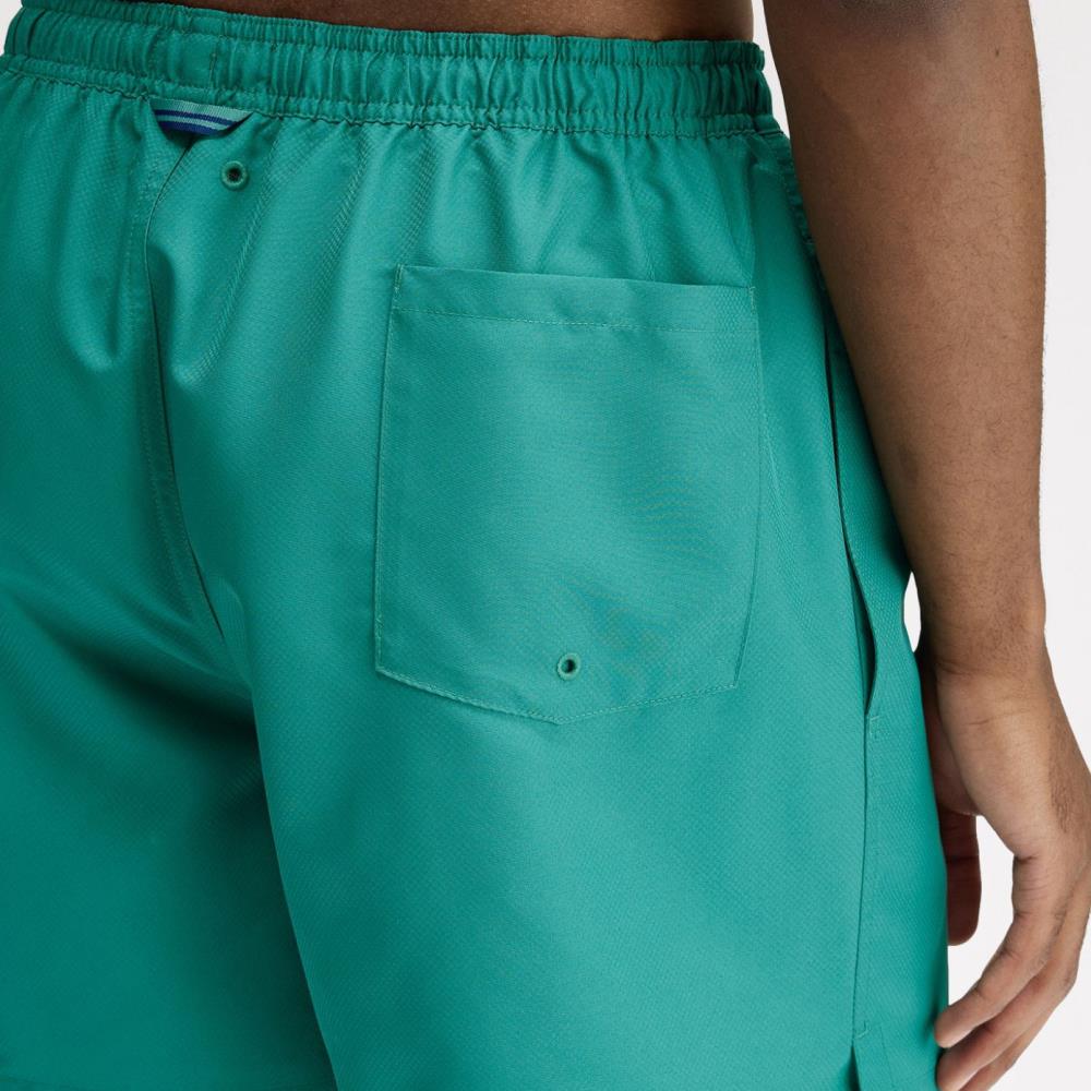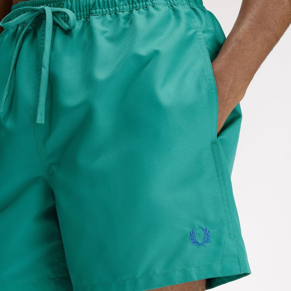 Os calções de banho com revestimento reciclado, finalizados com a coroa de louros bordada na perna esquerda: