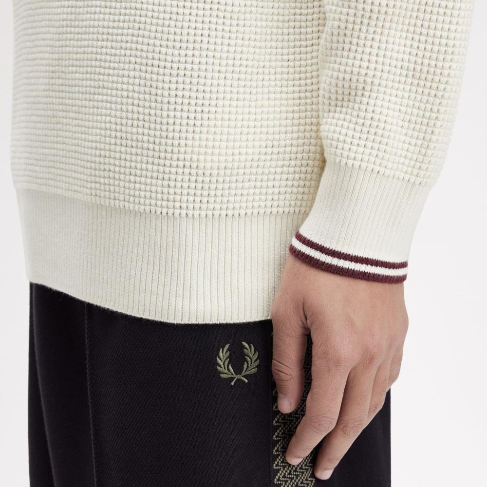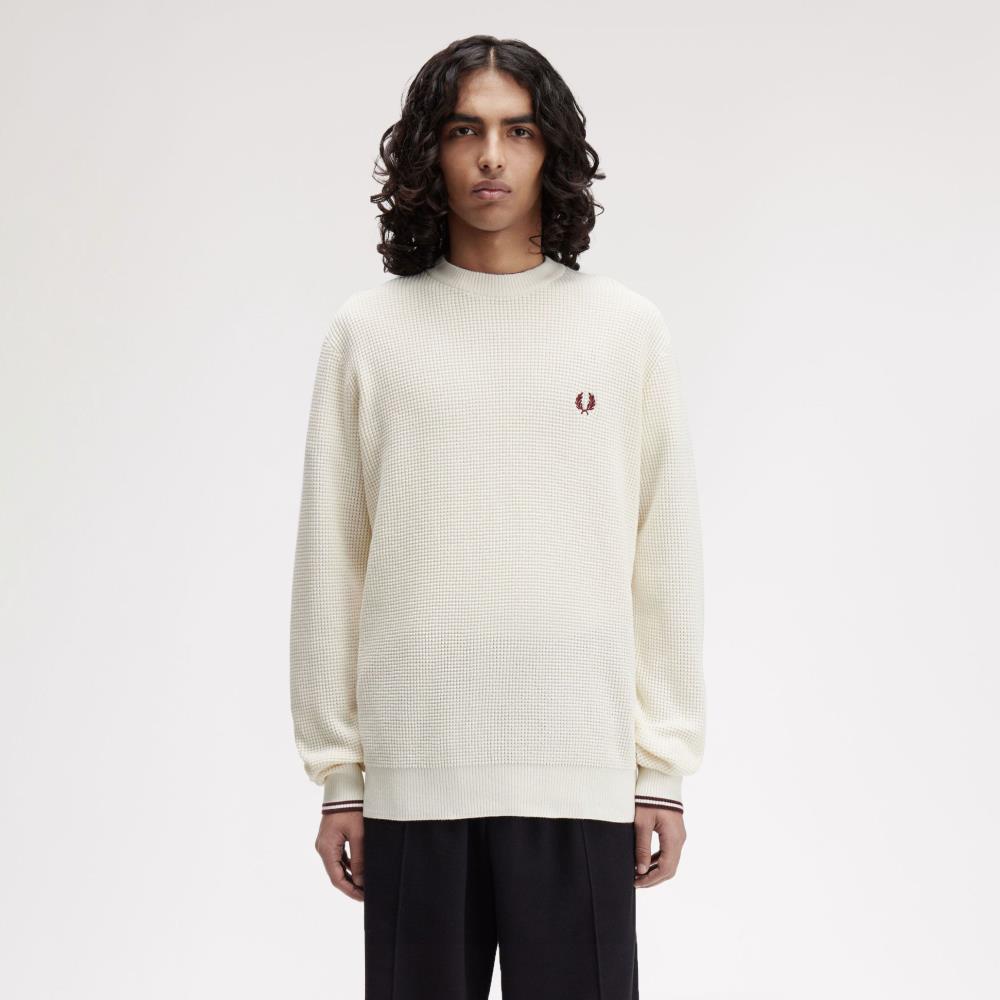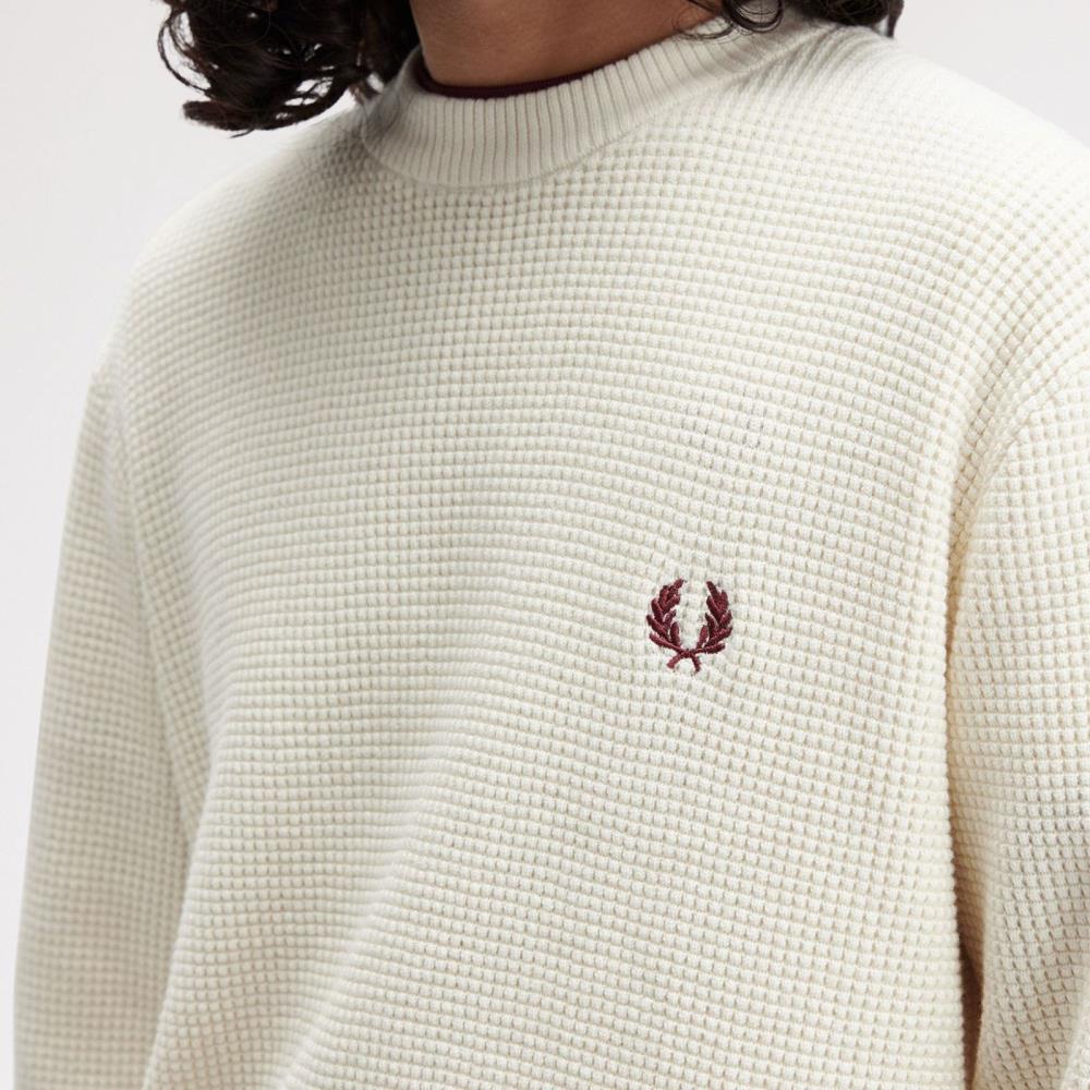 Uma sweater em algodão escovado com textura de pesponto waffle.