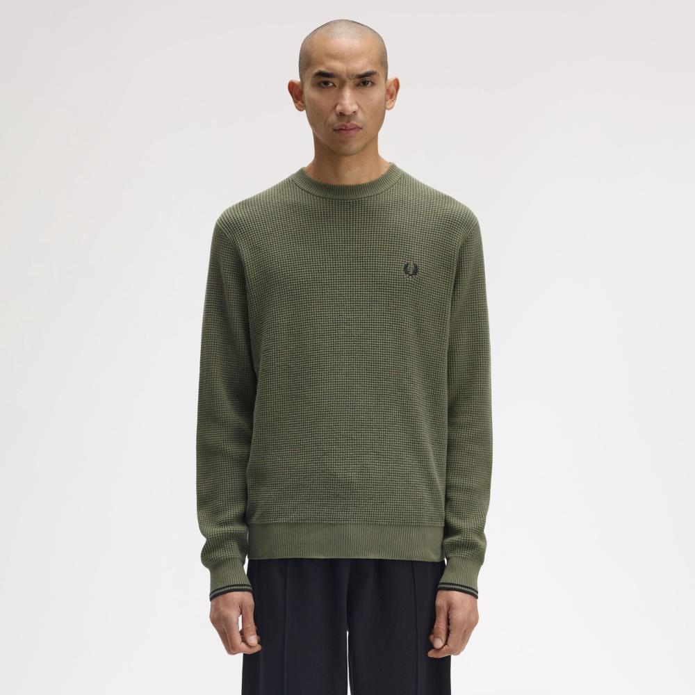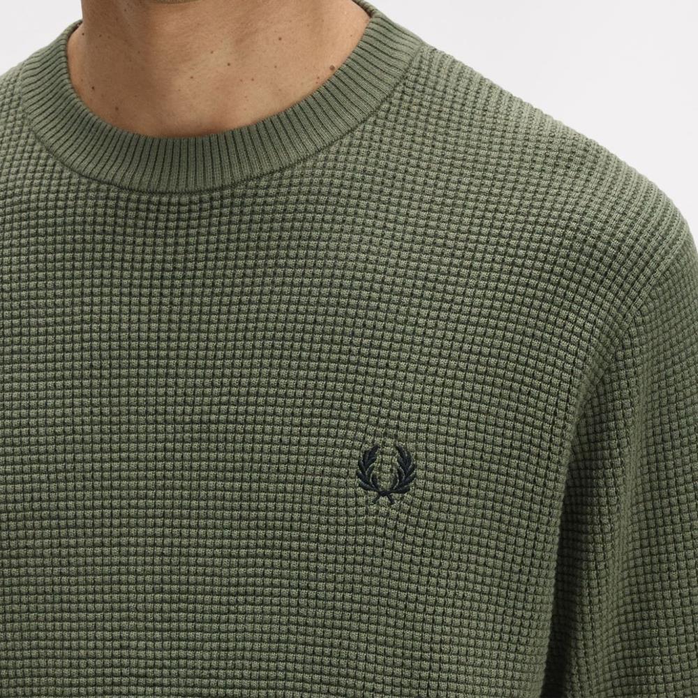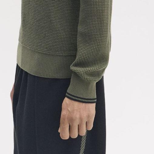 Uma sweater em algodão escovado com textura de pesponto waffle.