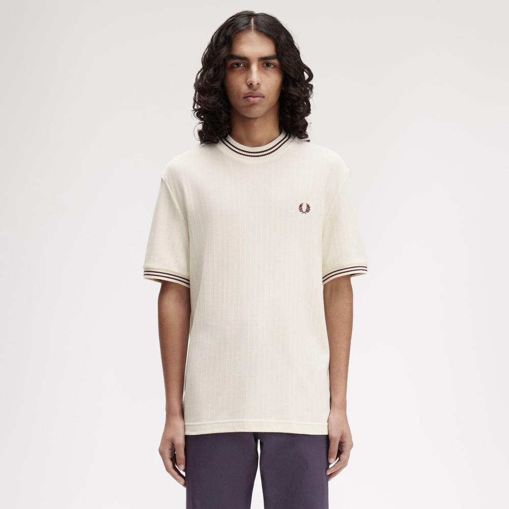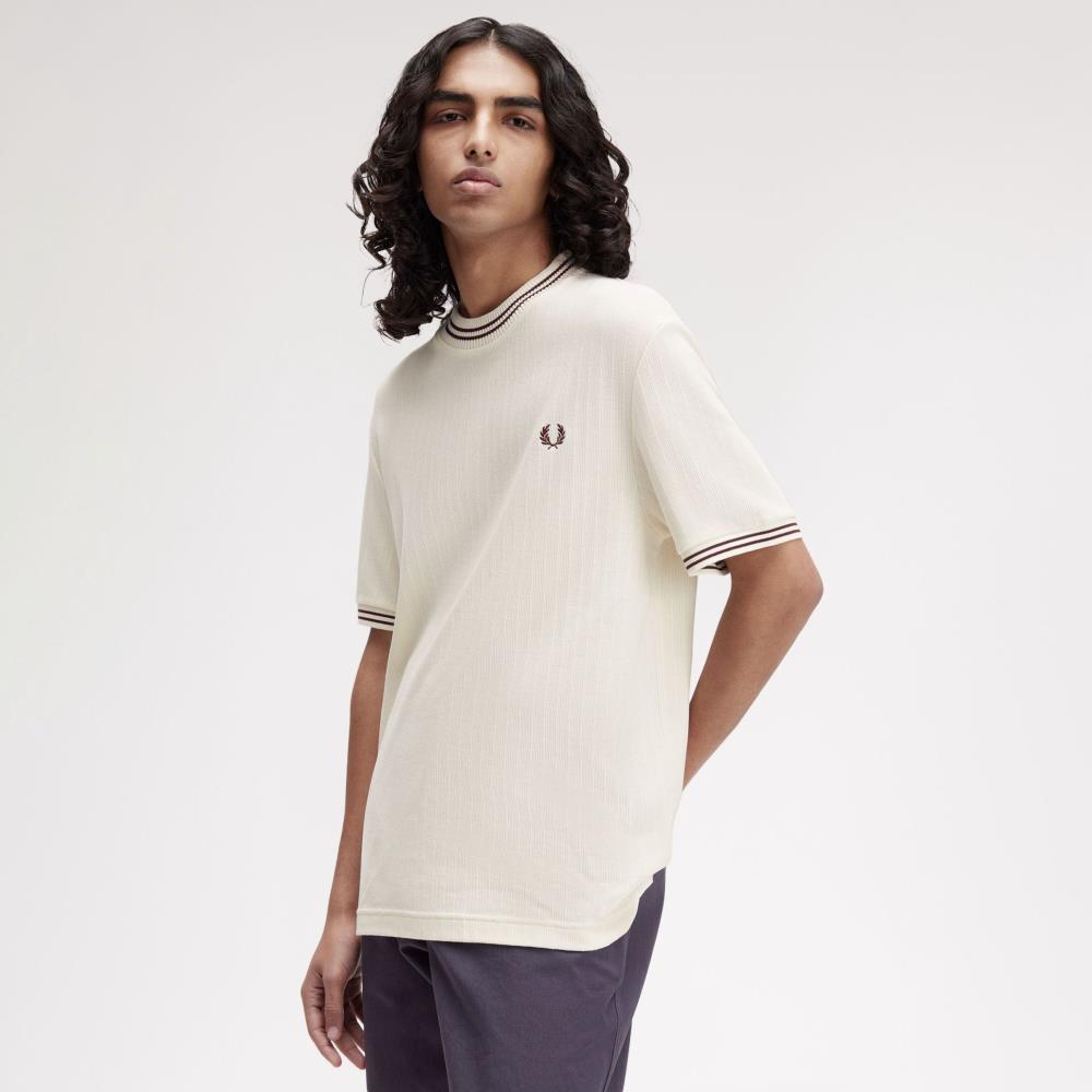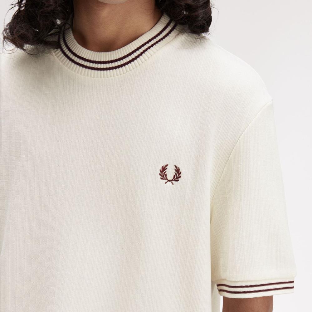 T-shirt em malha de algodão com detalhe de canelado largo e borda com ponto descontínuo dupla na gola redonda e nos punhos.