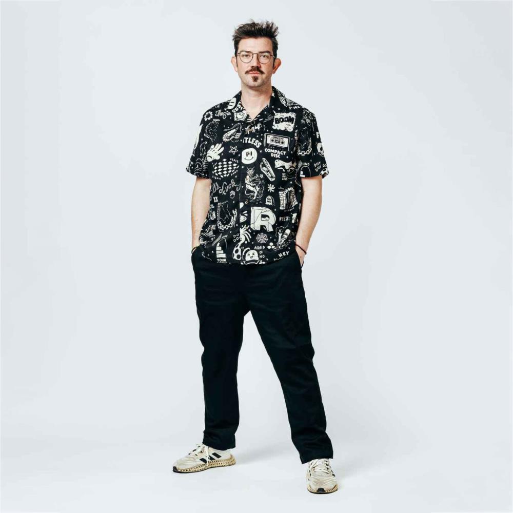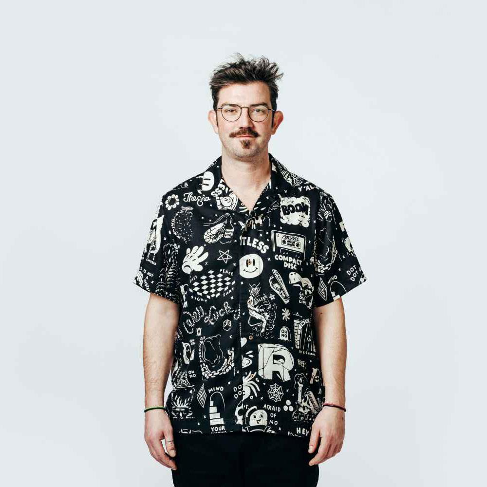Camisa havaiana multicolorida com padrão chamativo, desenhada por mcbess.